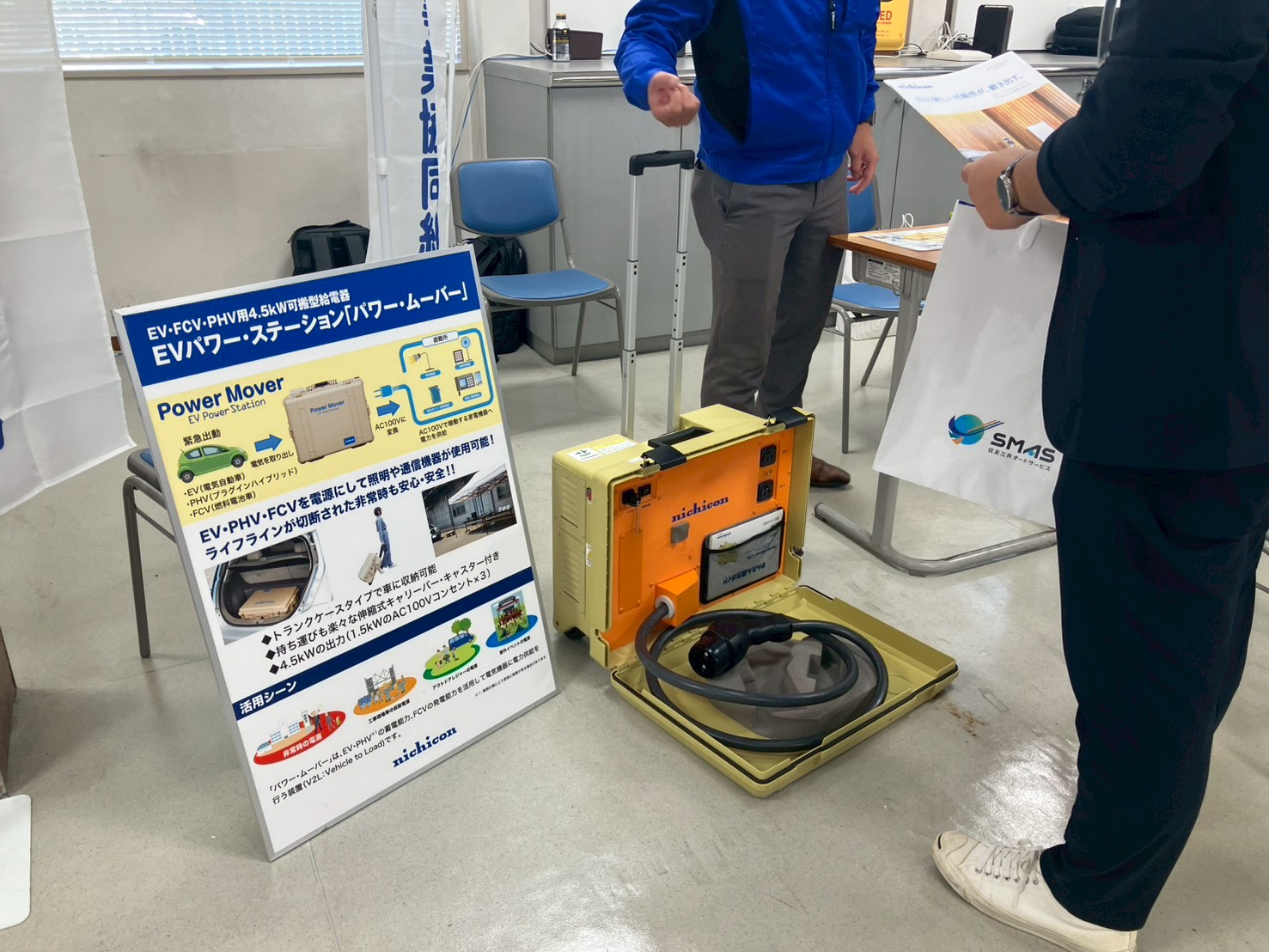 今回の展示品はニチコンの EVパワーステーション「パワー・ムーバー」を展示★ EV車等の電気を電気機器に供給する装置 (V2L:Vehicle to Load)です。 コンパクトで持ち運びに便利でトランクにも置いておけます!